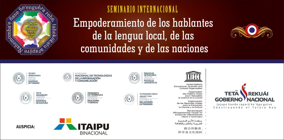 El seminario internacional “Empoderamiento de los hablantes de la lengua local, de las comunidades y de las naciones” será desarrollado en Asunción los días 3, 4 y 5 de julio de 2018. La apertura oficial del Seminario, que contará con altas autoridades locales y extranjeras, será el martes 3, a las 10:30, en el Crowne Plaza Hotel de la ciudad de Asunción.