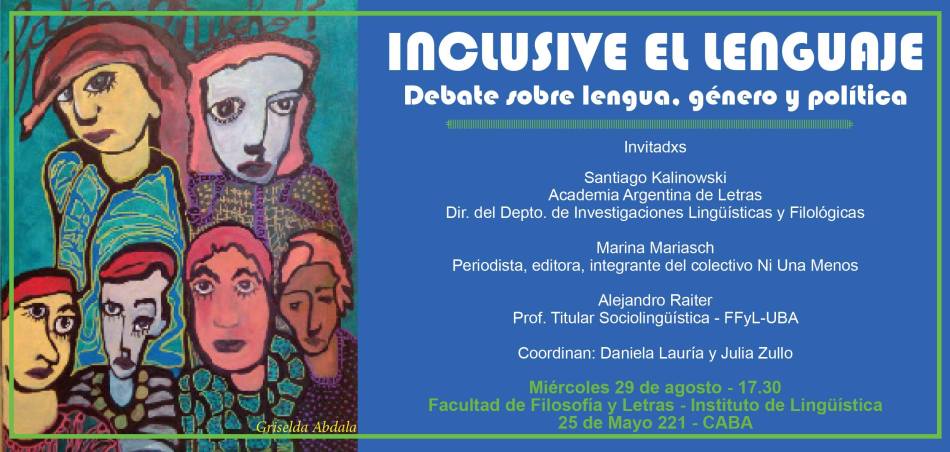 El Instituto de Lingüística (FFYL, UBA) invita a la charla “Inclusive el lenguaje. Debate sobre lengua, género y política”, a realizarse el día miércoles 29 de agosto a las 17.30 h. en sede de este instituto (25 de Mayo 221, 1er piso, CABA). Participan como invitadxs Santiago Kalinowski (Academia Argentina de Letras, Dir. del Depto. de Investigaciones Lingüísticas y Filológicas), Marina Mariasch (periodista, editora, integrante del colectivo Ni Una Menos) y Alejandro Raiter (Prof. Titular Sociolingüística – FFyL-UBA). Coordinan Daniela Lauría y Julia Zullo.