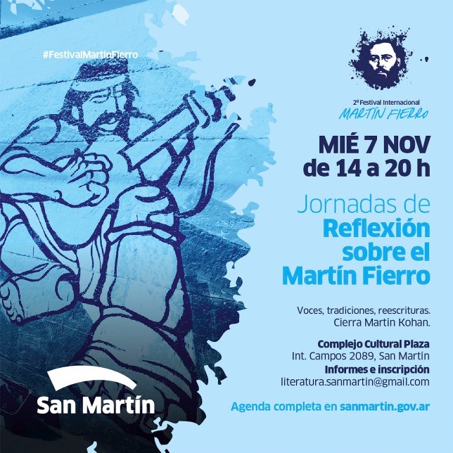 El miércoles 7 de noviembre de 14.30 a 19.30 se realizará una Jornada de reflexión sobre las voces y escrituras de las tradiciones nacionales a partir de la obra Martín Fierro. Se llevará a cabo en el Complejo Cultural Plaza, Int. Campos 2089, San Martín.