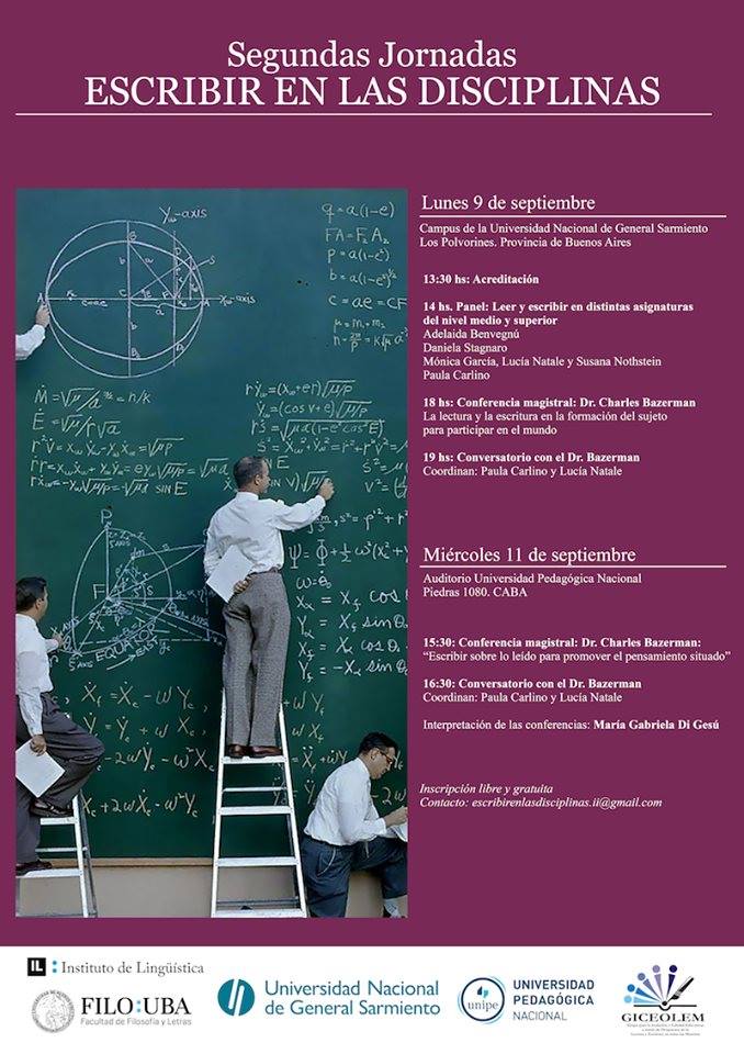 El lunes 9 septiembre y el miércoles 11 de septiembre tendrán lugar las Segundas Jornadas Escribir en las disciplinas destinadas a docentes del nivel superior y estudiantes de profesorados de todas las asignaturas. El primer día se desarrollarán en la UNGS, mientras que luego continuarán en la Universidad Pedagógica Nacional.