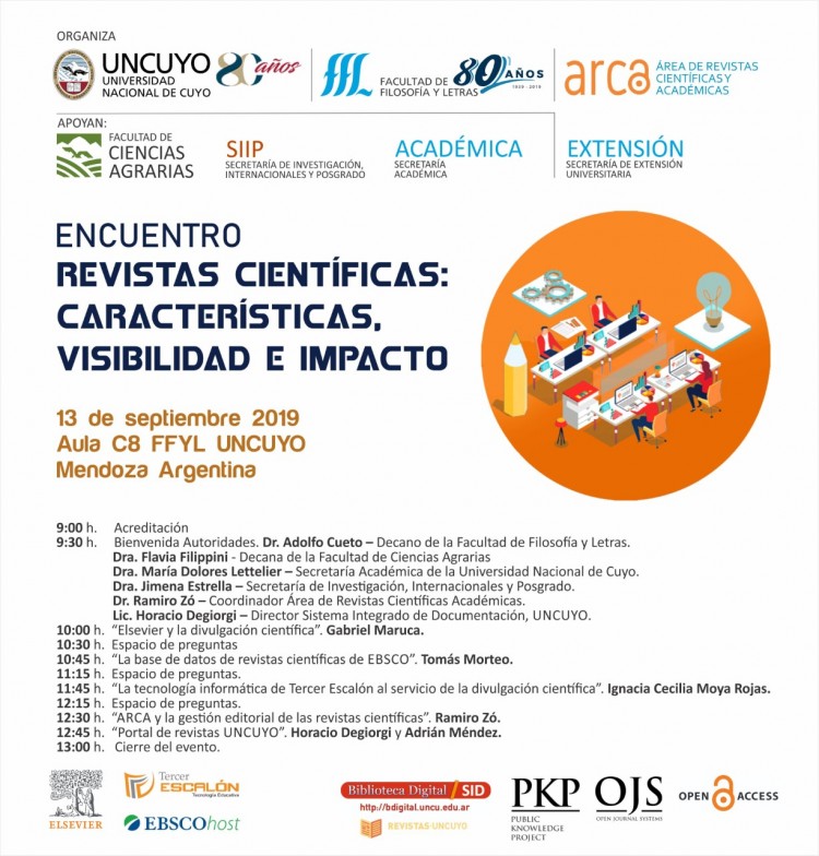 El Jueves 13 de septiembre de 2019, de 9 a 13, en el Aula C8 de la Facultad de Filosofía y Letras de la UNCUYO, se desarrollará el Encuentro “Revistas científicas: características, visibilidad e impacto”. Esta actividad es organizada por el Área de Revistas Científicas y Académicas (ARCA) y la Secretaría de Extensión Universitaria de la Facultad.