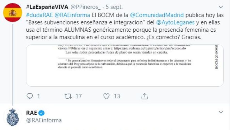 Un tuitero hacía una consulta a la Real Academia Española en la que le preguntaba por el uso del término ‘alumnas’ de manera genérica en el Boletín Oficial de la Comunidad de Madrid.
