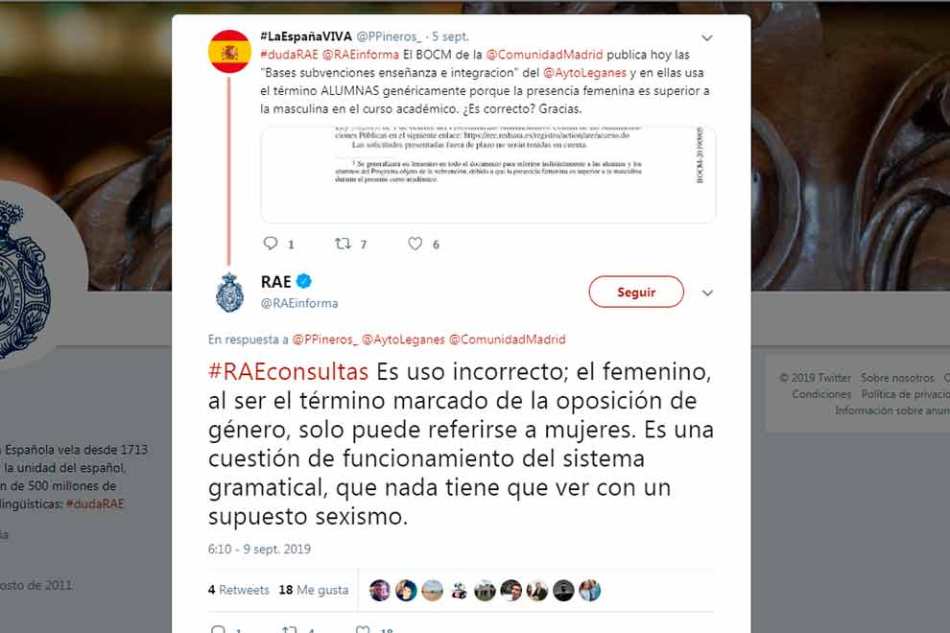 La RAE es contundente: “Es uso incorrecto; el femenino, al ser el término marcado de la oposición de género, solo puede referirse a mujeres. Es una cuestión de funcionamiento del sistema gramatical, que nada tiene que ver con un supuesto sexismo”