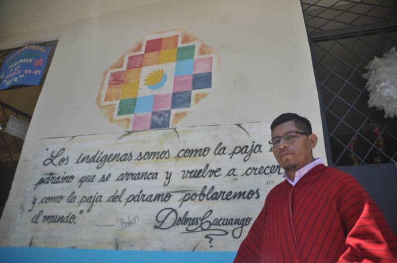 Luciendo su atuendo indígena el profesor, que también dicta clases de Estudios Sociales e Historia, cuenta que cuando recién llegó a la Costa se sintió discriminado por personas que tratan de humillar a los indígenas porque desconocen que Ecuador es plurinacional.