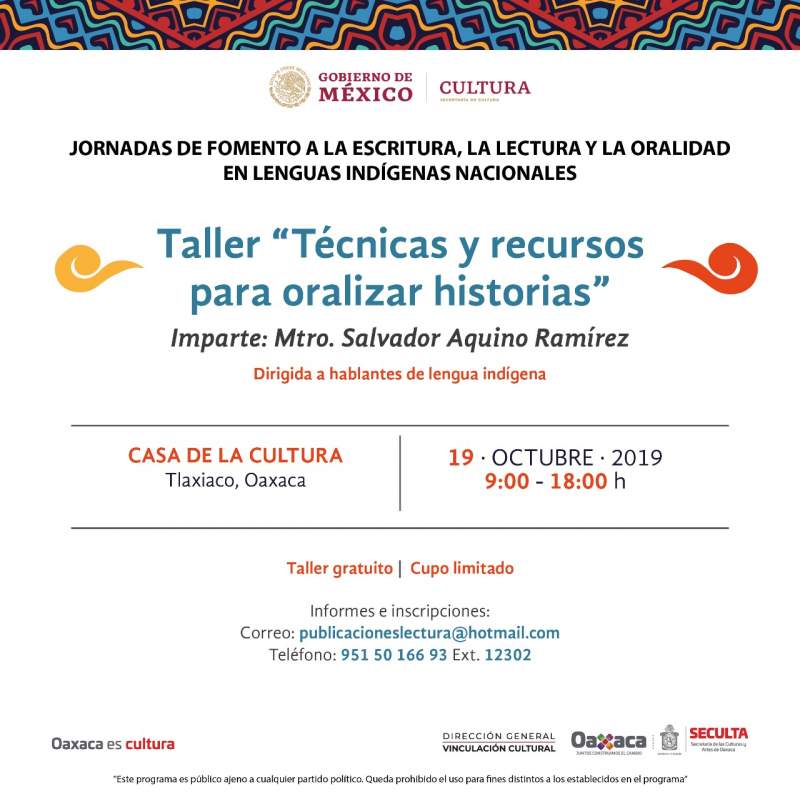 Dicho taller ofrecerá herramientas y técnicas a narradores orales, profesores, estudiantes, cuenta cuentos y mediadores de salas de lectura para fomentar la oralidad en algunas lenguas específicas y les ayude a relatar historias que son parte de la memoria de los pueblos originarios de Oaxaca.