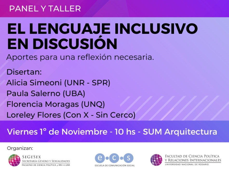 La Escuela de Comunicación Social y la Secretaría de Género y Sexualidades de la Facultad organizaron la Jornada: «El lenguaje inclusivo en discusión. Aportes para una reflexión necesaria», que tendrá lugar el viernes 1 de noviembre, a partir de las 10 hs, en el SUM de la Facultad de Arquitectura. La misma incluirá una panel de debate y un taller de experiencias.