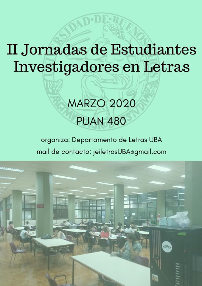 Tenemos el agrado de compartirles la Primera Circular de la II Jornada de Estudiantes Investigadorxs de la Carrera de Letras de la UBA, organizada por el Departamento de Letras. El evento, que se llevará a cabo en la sede Puan de la Facultad en marzo del 2020, tiene como objetivo principal generar un espacio de intercambio para aquellxs estudiantes de nuestra carrera que se hayan iniciado en el camino de la investigación académica, ya sea en el marco de una adscripción o bien de un proyecto de investigación institucionalmente reconocido (UBACyT o FiloCyT).