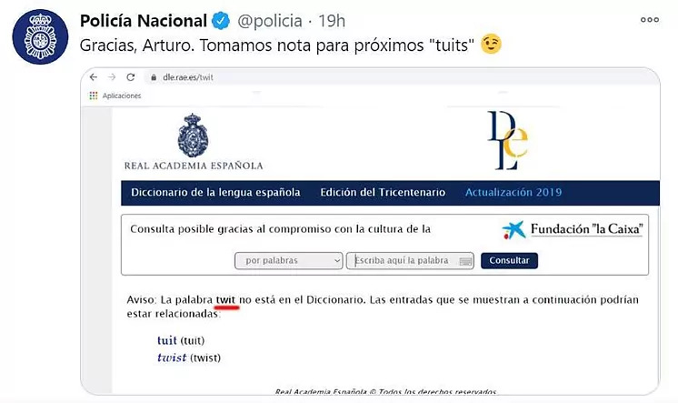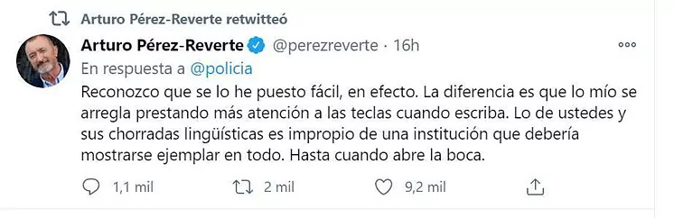 Con una captura de pantalla de la Real Academia Española en la que se avisa de que la palabra twit no está en el diccionario y que el uso correcto es tuit, la cuenta de la Policía Nacional ha escrito: «Gracias Arturo, tomamos nota para tus próximos ‘tuits'». Unas palabras cargadas de ironía que también han tenido su réplica en el autor de Alatriste, que no ha dudado en restar importancia a su equivocación y tildar de chorrada la manera de hablar de sus interlocutores.