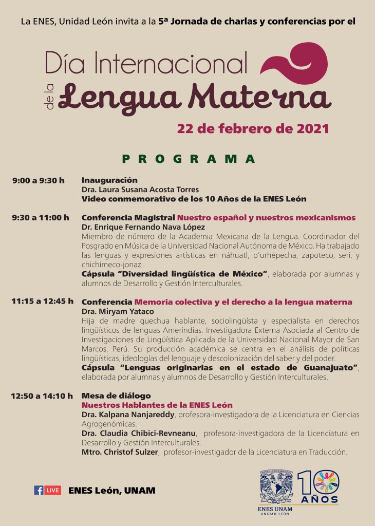 La ENES, León UNAM invita a la 5ª Jornada de charlas y conferencias por el Día Internacional de la Lengua Materna, que se llevará a cabo el 22 de febrero a partir de las 9:00 horas. El evento será transmitido en vivo en la página de Facebook: ENES León, UNAM.