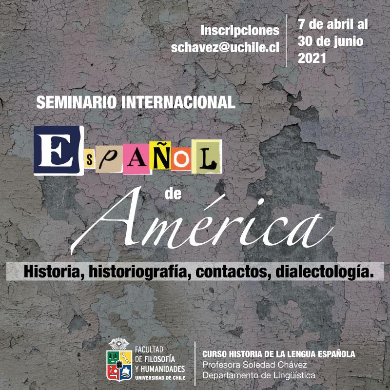 El Seminario Internacional Español de América. Historia, historiografía, contactos, dialectología es organizado en el marco del curso Historia de la lengua española, a cargo de la Prof. Soledad Chávez Fajardo. Se realizará completamente en línea entre el 7 de abril y el 30 de junio de 2021.