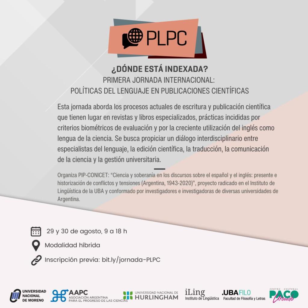 El 29 y 30 de agosto se realizará con modalidad híbhrida la Primera Jornada Internacional sobre Políticas del Lenguaje en Publicaciones Científicas “¿Dónde está indexada?” de 10 a 19 en el CCUPU, destinada a la comunidad científica y educativa interesada en la temática.