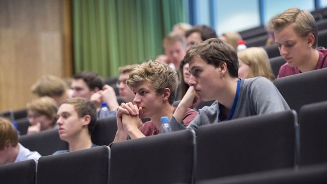 Estamos en Holanda, en una universidad: los estudiantes se sacan las chaquetas y las bufandas mientras el profesor abre unaSeguir leyendo