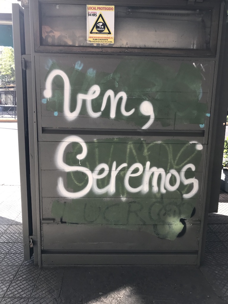 Las fotografías reproducidas son apenas un recorte microscópico de múltiples acciones glotopolíticas, abigarradas y dinámicas, refractarias a cualquier intento de captación y descodificación. Son instantáneas que seguro dicen más de mi propio periplo físico, sicológico e intelectual que del devenir del estallido social y las protestas, de la reacción gubernamental y la represión policial. Acaso no sean estas imágenes y el texto que las acompaña más que una muestra de mi torpe lenguajeo mientras trato (como siempre, extranjero ma non troppo) de seguir hablando con este / de este / en este país.