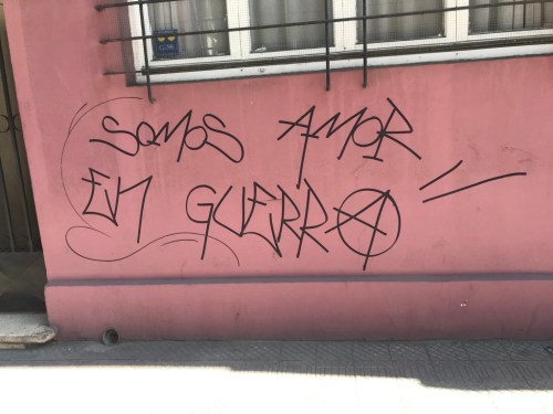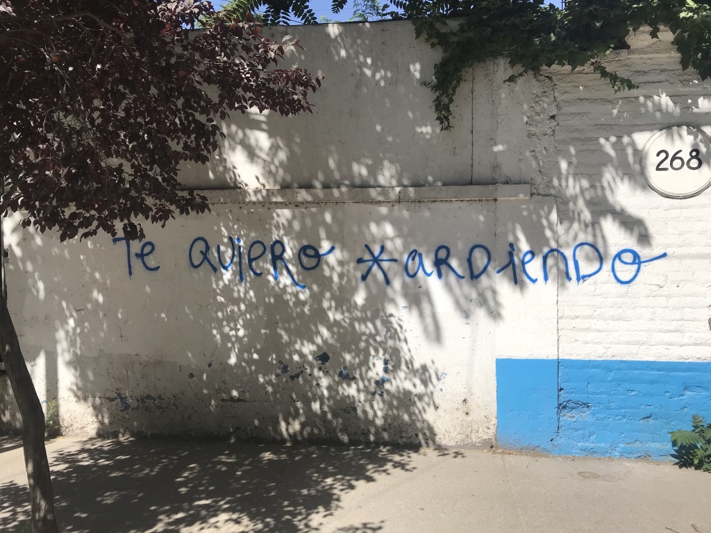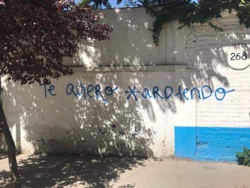 Ya recordé arriba que, desde muy pronto, el presidente Piñera intentó controlar el sentido del acontecimiento reduciéndolo a través de la imposición del tropo de la guerra como marco interpretativo. Y los muros, como ya conté, respondieron: VIOLENCIA ES DECLARARLE LA GUERRA AL PROPIO PUEBLO!: así decía, por ejemplo, el portón de hierro de un comercio clausurado en la avenida Vicuña Mackenna. Pero es necesario notar que el lenguajeo en torno a la guerra y la violencia que se integró en el paisaje glotopolítico santiaguino no se limitó a negar la veracidad de la declaración presidencial. Más rompedora que las negaciones de la propiedad representativa y la conveniencia pragmática del tropo bélico era la construcción de enunciados que ignoraban e incluso alteraban los límites de las figuraciones del discurso gubernamental. A(R)MATE, que HERMOSA te vei LUCHANDO, te quiero * ardiendo “significan” al tiempo que “son”, “están” al tiempo que “hacen”. Implican en el proceso de significación a la matriz léxico-gramatical y fusionan así campos semánticos que reducen no solo el significado de las palabras “guerra” o “violencia”, sino el sentido ético de la acción, abriendo en el acto comunicativo las posibilidades de reimaginarlas y reconstruir su relación, acaso no antagónica, con otro campo semántico: el del amor, la belleza y el querer. Pero también, en un gesto mcluhaniano, arrastran al mismo centro del mensaje convenciones ortotipográficas normalmente consideradas autónomas con respecto a la producción de significado: si the medium is the message, la calle como canal de la escena glotopolítica santiaguina revela un estallido semiótico y pone en entredicho el poder sostenido ya no solo por el lenguaje normado de la ciudad letrada, sino incluso por las lenguas de programación de la ciudad virtual.