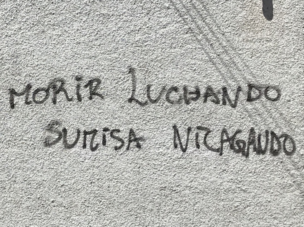 Pero en esta ocasión aquella naturalidad con que abordaba siempre la interacción con la urbe se había desvanecido ante una experiencia sensorial transformada y, por lo mismo, transformadora. La ventana del asiento trasero del taxi en movimiento me ofrecía una singularísima lente para la observación: me abría un campo de visión reducido forzándome a concentrar la mirada en busca del detalle; pero, a la vez, la exposición efímera a un objeto, cualquiera que fuese, me obligaba a percibirlo apenas como un constituyente más de una elusiva sintaxis panorámica. Pako perkin, asamblea constituyente… [Semáforo roto], muerte al patriarcado!!!… Piñera qlo, [imagen de un ojo ensangrentado] [La Vega], Go vegan, [Imagen de Matías Catrileo] [Parque Forestal] acabla TV miente… wallmapu libre!!!… Educación gratuita…, [Barrio Bellas Artes], [Bandera mapuche. Imagen de un puño] Evade!!! [Cerca del GAM] Salud digna… [En un árbol: imagen de un kultrún] Die Piñera dieprohibido olvidar… [Bandera mapuche] Piñera CTM… [Imagen de Mon Laferte] Muerte a la yutalas fronteras tb son violentas… [Barrio Santa Isabel] Migrantes, putas y pueblo disidente contra el estado asesino… Así más o menos iba pasando por aquella ventana el desconcertante paisaje en movimiento, y se me iba imponiendo la necesidad de aprender de nuevo a hablar con esta / de esta / en esta ciudad, el imperativo de aprender a lenguajear este espacio reinventado por la acción ciudadana, la reacción político-policial y el conflicto de imaginarios que se disputaba, entre otros muchos espacios, en la geografía urbana y en la palabra.