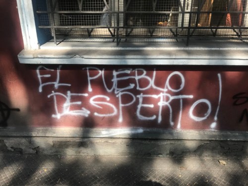 Durante varios días recorrí, a distintas horas, las calles de Ñuñoa, Providencia, Recoleta y Santiago Centro. Resultaba evidente que, en el curso de las anteriores semanas, una zona concreta de la ciudad había adquirido un valor material y simbólico especial: la Plaza Baquedano, popularmente llamada Plaza Italia y rebautizada durante la revuelta como Plaza de la Dignidad. Las protestas del sector gravitaban en torno a esta emblemática intersección (eje articulador del tránsito entre aquellas cuatro comunas), donde se registraban tanto entusiastas e imaginativas celebraciones y reivindicaciones políticas como violentas confrontaciones entre manifestantes y policías. Como efecto de estas últimas, la estación Metro Baquedano resultó destruida (igual que muchas otras del sistema) y la estatua del general homónimo intervenida por la más variopinta combinación de grafitis y disfraces. Al mismo tiempo, los muros de los edificios que rodean la plaza y las calles aledañas participaron de una explosión discursiva que se sumó a los acontecimientos como forma de lucha abierta por la necesaria atribución de sentido de lo que se estaba viviendo.