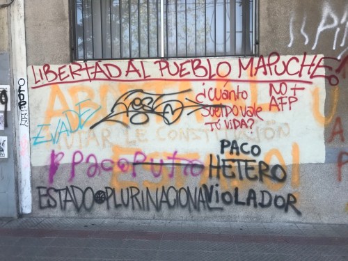 Afecto, admiración y lucha, acabamos de ver, se nos presentan entreveradas en enunciados que perturban las asociaciones que convencionalmente generan la función social de las nociones del amor y de la guerra. Pero es crucial señalar que una propiedad central del lenguajeo de la revuelta está en su incontrolable multivocalidad, en su impronta radicalmente heteroglósica. Múltiples voces coexisten en los muros de la ciudad y sus respectivas localizaciones sociales —e incluso nacionales— son extraordinariamente heterogéneas; ni siquiera resultan automáticamente transparentes: Chili ak Haiti ini nou kon inegaliti, amulepe taiñ weichan, donec dignitas fiat consuetudine, baise la police, fuck Piñera, Piñera coño e madre, pako asesino violador y vo tambien milico CTM. Es más, el abigarrado lenguajeo exhibe tensiones internas, en la permanente renovación de un lenguaje cuyas formas se superponen unas sobre otras, ocultándose, matizándose, negándose… paco puto HETERO. El paisaje glotopolítico santiaguino registró la manifestación de múltiples subjetividades en disputa, una lucha intensa y multidireccional por la manifestación de sujetos excluidos por el entramado político-económico-discursivo neoliberal y que llevaban décadas pugnando por hacerse oír: el movimiento pingüino, la resistencia del pueblo mapuche, la acción feminista, la defensa de los derechos de los inmigrantes, la lucha de clases…